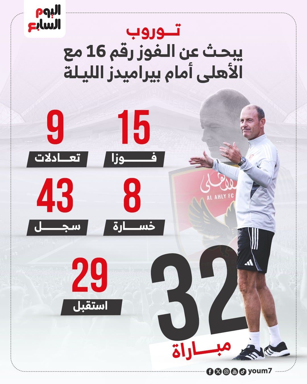 وتعد هذه المباراة رقم 33 للدنماركي ييس توروب المدير الفني للنادي الأهلي، منذ توليه القيادة الفنية للفريق في أكتوبر الماضي 2025، وخلال 32 مباراة سابقة، خاضها الفريق الأول لكرة القدم بالنادي الأهلي تحت قيادة توروب، نجح الأهلى فى تحقيق الفوز في 15 مباراة، وتلقى الهزيمة فى 8 لقاءات، وحضر التعادل فى 9 مباريات.