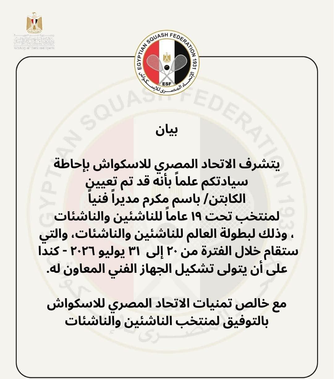 وجاء بيان اتحاد الاسكواش كالتالي: