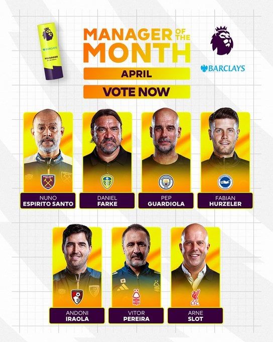 ضمت قائمة المرشحين على جائزة أفضل مدرب في أبريل بالدوري الإنجليزي، 7 مدربين بيب جوارديولا، الذي حقق فريقه مانشستر سيتي ثلاثة انتصارات متتالية ليطارد المتصدر أرسنال، وآرني سلوت، الذي أنعش آمال ليفربول في دوري أبطال أوروبا بثلاث مباريات متتالية دون هزيمة.