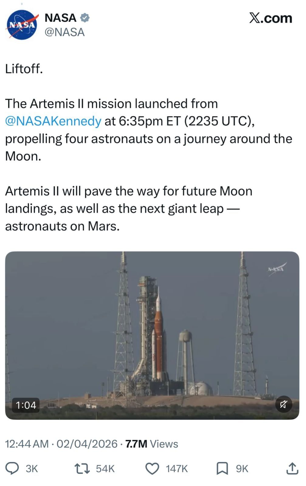 أطلقت ناسا مهمة Artemis II، في خطوة تاريخية تمثل عودة الرحلات المأهولة نحو القمر لأول مرة منذ 50 عامًا. وجرت عملية الإطلاق بنجاح باستخدام صاروخ Space Launch System والمركبة الفضائية Orion spacecraft من منصة الإطلاق 39B في Kennedy Space Center.