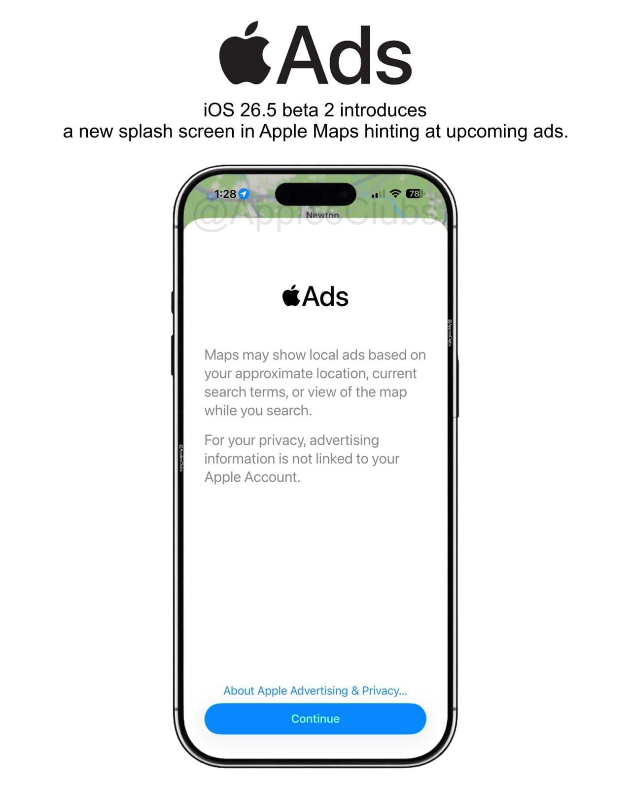 كشفت شركة أبل عن توجه جديد قد يثير الجدل بين المستخدمين، وذلك بعد ظهور شاشة ترحيبية جديدة داخل تطبيق Apple Maps في تحديث iOS 26.5 Beta 2، تشير بشكل واضح إلى إدخال الإعلانات ضمن تجربة استخدام الخرائط.